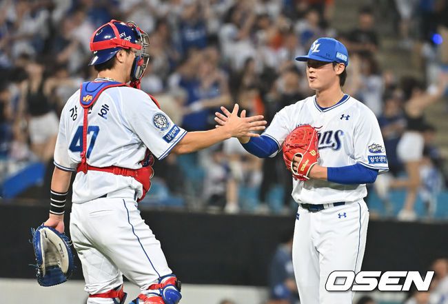 [OSEN=대구, 이석우 기자] 25일 대구삼성라이온즈파크에서 2025 신한 SOL 뱅크 KBO 리그 삼성 라이온즈와 한화 이글스의 경기가 열렸다. 홈팀 삼성은 후라도가, 방문팀 한화는 와이스가 선발 출전했다. 삼성 라이온즈 이호성과 강민호가 한화 이글스에 7-2로 승리한 후 기쁨을 나누고 있다. 2025.06.25 / foto0307@osen.co.kr 이 기사의 카테고리는 언론사의 분류를 따릅니다.0공유하기