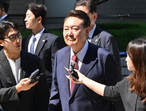 윤석열 전 대통령이 지난 23일 서울 서초구 서울중앙지방법원에서 열린 내란 우두머리 혐의·직권남용 권리행사 방해 혐의 사건 8차 공판에 출석하고 있다./연합뉴스 |
