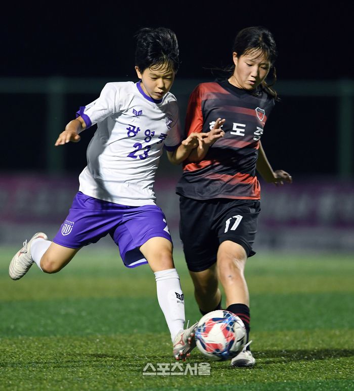 전남 광영중 박예솔(왼쪽)이 25일 경남 합천에서 열린 ‘2025 스포츠케이션 명품도시 합천에서 펼쳐지는 제33회 여왕기 전국여자축구대회’ 중등부 경북 포항항도중과의 8강전에서 포항항도중 문서현과 공을 다투고 있다. 2025. 6. 25.