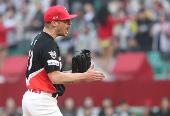 [서울=뉴스핌] KIA의 외국인 투수 아담 올러가 지난 5월 10일 문학 SSG와의 경기에서 6이닝 무실점 뒤 환호하고 있다. [사진 = KIA] 2025.05.10 wcn05002@newspim.com |