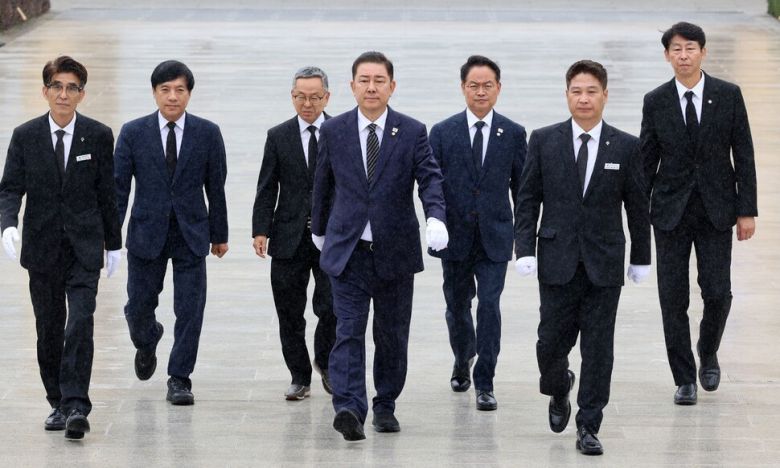 더불어민주당 김병기 당 대표 직무대행 겸 원내대표를 비롯한 당 관계자들이 25일 오후 국립대전현충원에서 참배하기 위해 이동하고 있다. 연합뉴스 |