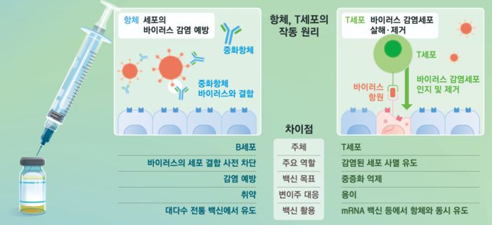 다만 T세포 기반의 백신이 적극 활용되기 위해서는 백신의 사회적 목표가 바뀌어야 한다. 항체는 바이러스가 세포로 침입하지 못하게 하는 만큼 감염 자체를 ‘예방’하는 백신을 만들 수 있다. 반면 T세포는 감염을 막지는 못하되 바이러스 감염병이 중증으로 진행되는 것은 억제할 수 있다.