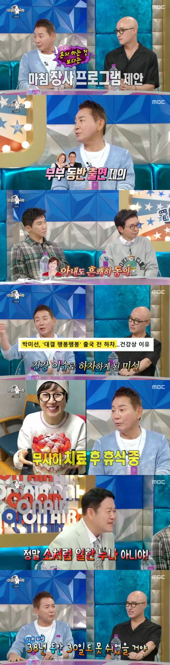 이에 김국진은 박미선의 건강 상태를 궁금해했고, 이봉원은 "치료 잘 받고 쉬고 있다. 38년동안 한 번도 못 쉬었다. 한달도 못 쉬었을거다. 이번 기회에 재충전하고 있다"고 했고, 이를 들은 김구라는 "형은 중간에 놀러라도 다녀왔지 그 누나가 정말 소처럼 일했다"고 말해 눈길을 끌었다.