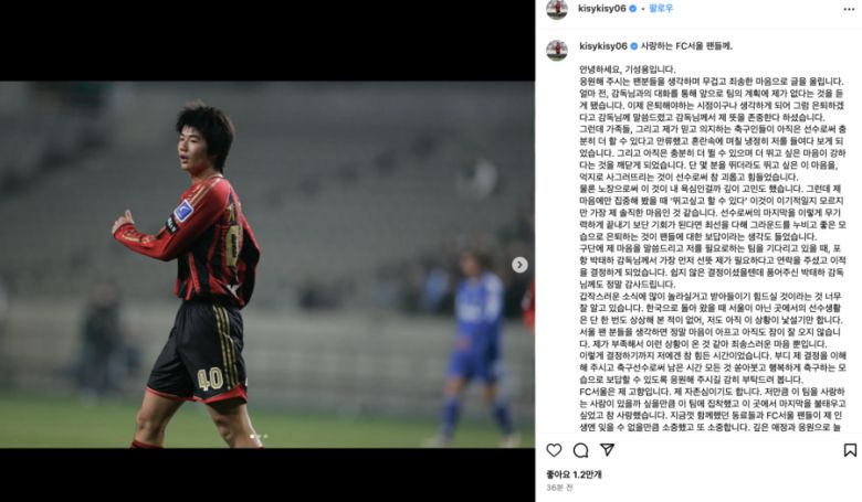 이렇게 결정하기까지 저에겐 참 힘든 시간이었습니다. 부디 제 결정을 이해해 주시고 축구선수로써 남은 시간 모든 것 쏟아붓고 행복하게 축구하는 모습으로 보답할 수 있도록 응원해 주시길 감히 부탁드려 봅니다.