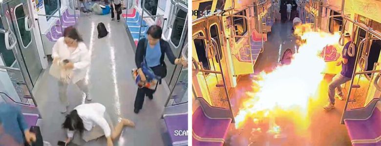 지난달 31일 서울 지하철 5호선 열차 안에서 발생한 방화 사건 당시의 모습. 60대 남성이 객실 한가운데에 휘발유를 뿌리자 승객들이 놀라 대피하고 있다(왼쪽 사진). 한 임신부는 급하게 대피하다 바닥에 넘어졌다. 오른쪽 사진은 휘발유에 불이 붙어 타오르는 모습. 당시 시민들과 기관사가 소화기로 불을 진압해 인명 피해는 없었다. 서울남부지검은 25일 객실에 불을 지른 원모(67)씨를 살인 미수 등 혐의로 구속 기소했다고 밝혔다.