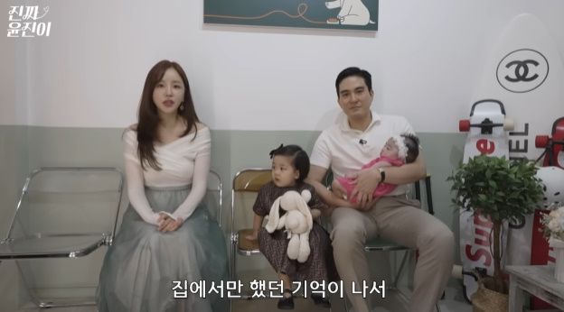 이날 윤진이는 남편과 두 딸과 함께 스튜디오를 찾았다. 그는 "오늘 100일 사진 촬영하러 왔다. 100일 200일 다 챙겨서 성대하게 파티 해야하나 돌은 어떻게 해야하나 그랬는데 저희는 첫째는 거의 집에서 다 했고 돌때만 챙겨주자 해서 집에서만 했던 기억이 나서 둘째도 소소하게 하고싶다는 생각을 해서 조그마한 스튜디오 와서 촬영하는걸로 대체하려 한다"고 설명했다.