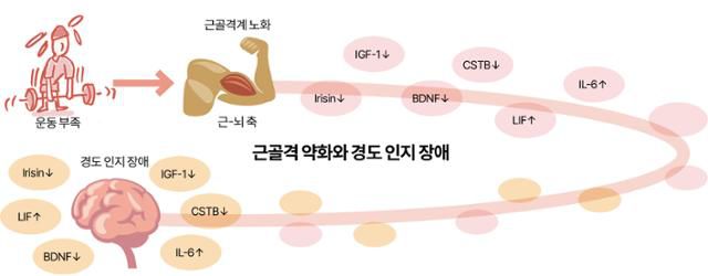 장을 구성하는 세포들과 대장 속 미생물들이 뇌 기능에 영향을 주는 과정인 '장-뇌 축'(gut-brain axis)에서 장 세포들이 분비하는 호르몬들의 뇌 기능 관련 역할이 밝혀지고 있듯이 근육 세포들이 분비하는 마이오카인들의 뇌 기능 관련 역할도 속속 확인되고 있다. 특히 앞서 소개한 BDNF는 그 대표적 단백질 중 하나다.