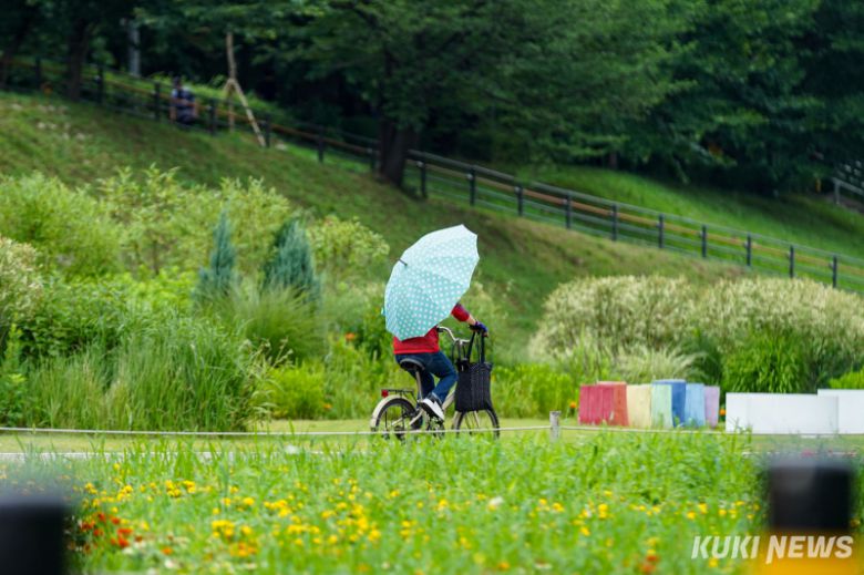 25일 서울 구로구 안양천 수변공원에서 한 시민이 우산을 받쳐들고 자전거를 타고 있다. 유희태 기자