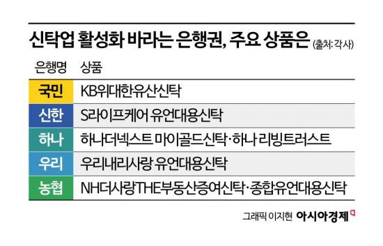 은행들은 자체적으로 신탁업 강화에 나서고 있다. 기존 상품을 재정비해 내놓거나 신상품을 출시하는 등 적극적이다. 농협은행은 올해 들어 신탁 상품 2개(부동산증여신탁·종합유언대용신탁)를 선보였다. 부동산증여신탁은 신상품으로, 부동산 가치 상승 이전에 사전 증여를 통해 증여세 부담을 줄여준다. 수증자에게 일정 의무를 부여하는 조건부 증여 설계도 가능하다.