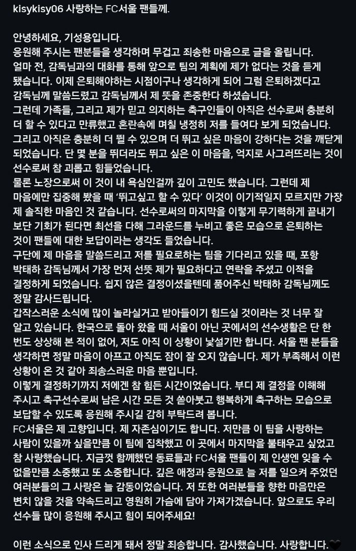 [스포츠조선 윤진만 기자]'서울 레전드' 기성용(36)이 진심을 꾹꾹 눌러담은 입장문으로 서울팬에게 작별을 고했다.