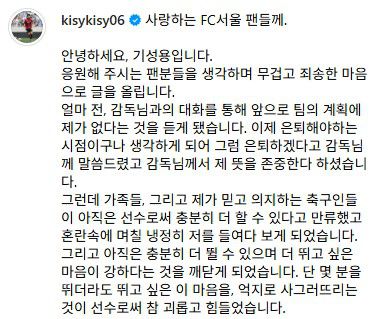 기성용은 25일 늦은 오후 자신의 SNS를 통해 서울과 결별 소식을 공식화했다. 기성용은 "얼마 전 (김기동) 감독님과 대화를 통해 앞으로 팀의 계획에 (내가) 없다는 것을 듣게 됐다. 그래서 '은퇴해야 하는 시점이구나' 생각하게 돼 은퇴하겠다고 말씀드렸고, 감독님께서 제 뜻을 존중한다고 하셨다"고 전했다.