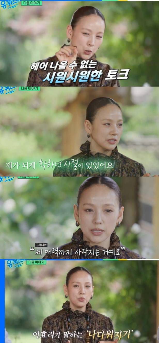 이후 이효리는 "되게 착하던 시절이 있었다. 지치고 힘드니까 '그냥 입을게요, '좋아요 그냥 할게요'라고 했다. 그 모습이 매력까지 사라지더라"라며 "제가 마음 가는 대로 살고 말하고 있는 그대로 보여주기로 했다"며 '이효리 마인드'가 되기까지의 과정에 대해 이야기해 시선을 집중시켰다.