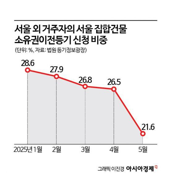 이들은 아파트만 집중 공략하고 있다. 아파트와 오피스텔, 연립주택, 다세대주택 등을 포함한 집합건물 투자 비중은 하락했다. 법원 등기정보광장에 따르면 집합건물에 대한 소유권이전등기(매매) 신청자 중 외지인 비중은 21.6%로 집계됐다. 올해 1월 해당 비중은 28.6%를 기록했지만 4개월 만에 7%포인트 내렸다.