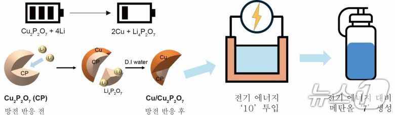 배터리 방전처럼 전극 재료에 전류를 흘려주면 전극에 포함된 구리 피로인산염 일부가 순수 구리로 환원되며 두 물질이 한 입자 안에서 자연스럽게 섞이는 복합 구조가 형성된다.