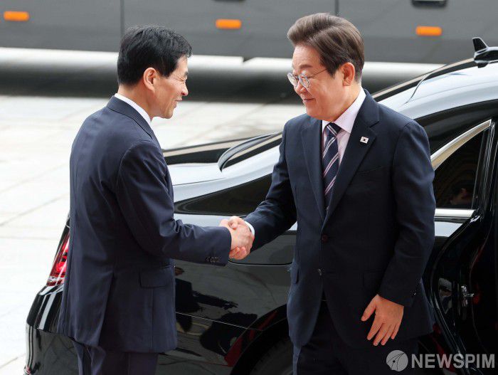[서울=뉴스핌] 국회사진기자단 = 이재명 대통령이 26일 서울 여의도 국회에서 시정연설을 하기 위해 도착해 김민기 국회 사무총장과 인사를 나고 있다. 2025.06.26 photo@newspim.com