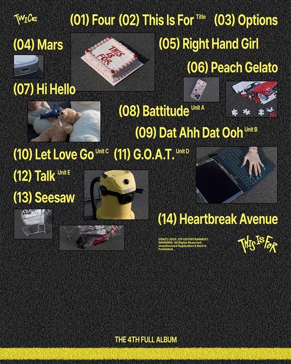 트와이스는 7월 11일 네 번째 정규 앨범 ‘THIS IS FOR’를 발매한다. 이에 앞서 JYP엔터테인먼트는 6월 26일 0시 트와이스 공식 SNS 채널에 트랙리스트 이미지와 함께 신보에 실리는 전곡 곡명을 공개했다.