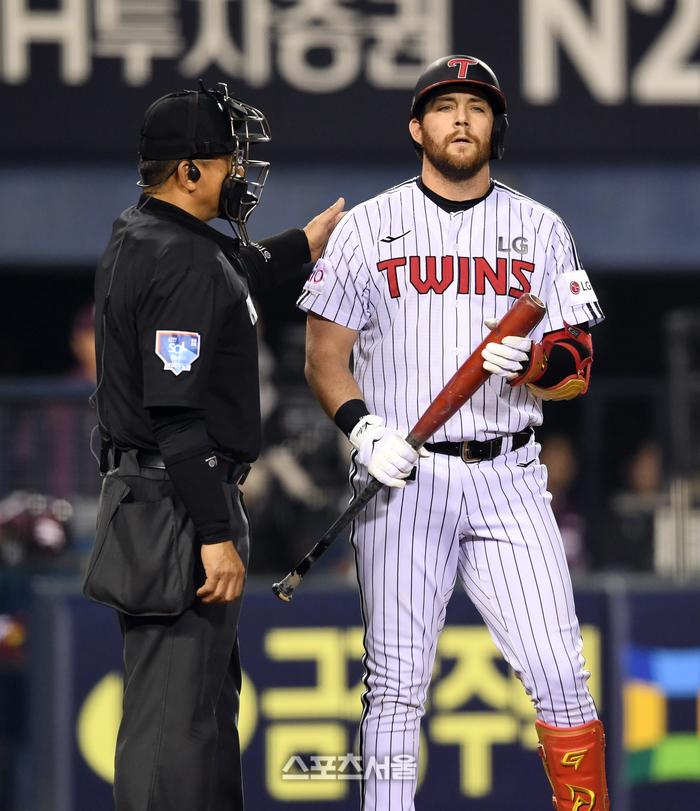 LG 오스틴(오른쪽)이 삼진을 당한 뒤 아쉬워 하고 있다. 잠실 | 박진업 기자 upandup@sportsseoul.com