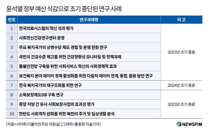 이 외에도 중앙 지방 간 유사 사회보장사업의 효과성 평가, 소득보장제도 데이터베이스(DB) 구축 연구, 한반도 사회격차 완화를 위한 북한의 주거 및 일상생활 분석 연구도 2023년에 예산 부족으로 중단됐다.