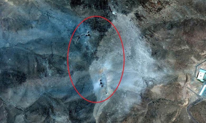 미국의 벙커버스터 공격을 받은 이란 포르도 시설에 구멍이 3개씩 2곳(빨간원)에 남아 있다. 로이터연합뉴스, 막사르 테크놀로지 제공 |