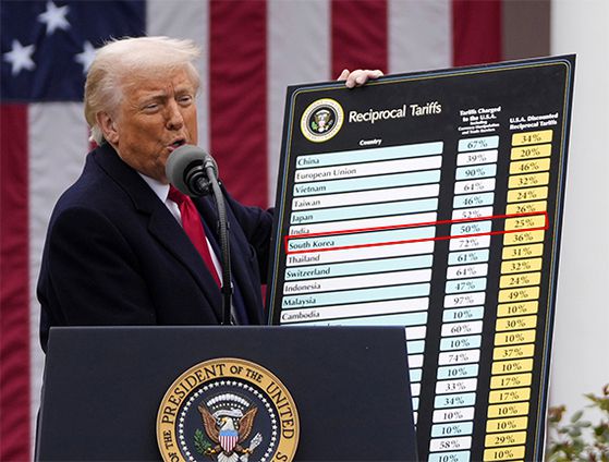 도널드 트럼프 미국 대통령이 지난 4월 2일(현지시간) 상호관세를 발표할 때 사용한 차트에 한국의 관세가 25%(빨간 네모 안)로 표기돼 있다. 한국의 대미 관세율은 50%로 표기돼있다. AP=연합뉴스 |