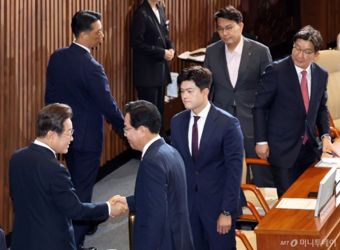 이재명 대통령이 26일 서울 여의도 국회 본회의장에서 추가경정예산(추경) 시정연설을 마친 후 송언석 국민의힘 원내대표와 악수하고 있다. 왼쪽부터 이 대통령, 국민의힘 송 원대표, 김용태 비상대책위원장, 윤상현 의원, 권성동 의원. 2025.06.26. /사진=뉴시스 /사진=고범준