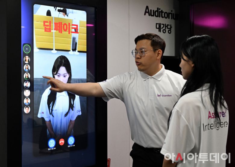 아시아투데이 박성일 기자 = 26일 오전 서울 용산구 LG서울역빌딩에서 열린 '익시오 안티딥보이스(ixi-O Anti-DeepVoice)' 출시 AI 보안 기술설명회에 마련된 체험존에서 LG유플러스 직원들이 합성된 영상의 진위 여부를 파악할 수 있는 AI 기술인 안티딥페이크를 시연하고 있다.