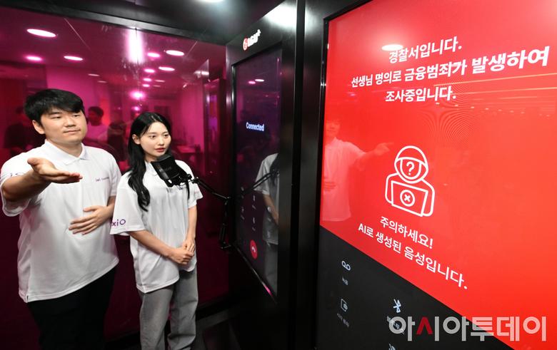 아시아투데이 박성일 기자 = 26일 오전 서울 용산구 LG서울역빌딩에서 열린 '익시오 안티딥보이스(ixi-O Anti-DeepVoice)' 출시 AI 보안 기술설명회에 마련된 체험존에서 LG유플러스 직원들이 합성된 음성의 진위 여부를 파악할 수 있는 AI 기술인 '안티딥보이스'를 소개하고 있다.