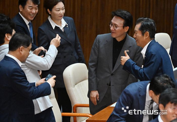 26일 서울 여의도 국회에서 이재명 대통령의 2025년도 제2차 추가경정예산(추경)안 시정연설이 열린 가운데 김민석 국무총리 후보자와 정청래 더불어민주당 의원이 사진을 찍고 있다. 이동근기자 foto@etnews.com [Copyright © 전자신문. 무단전재-재배포금지] 이 기사의 카테고리는 언론사의 분류를 따릅니다.0공유하기
