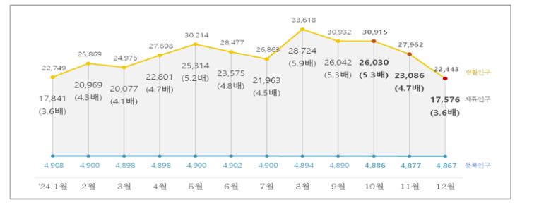인구감소지역 전체의 생활인구는 2024년 4분기 중 10월 약 392만명, 11월 2796만명, 12월 2244만명으로 3분기에 비해 전반적으로 감소했다.