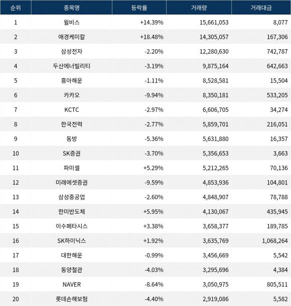 한편 거래량 상위 20위권 종목들은 파미셀(005690) ▲5.29%, 미래에셋증권(006800) ▼9.59%, 삼성중공업(010140) ▼2.60%, 한미반도체(042700) ▲5.95%, 이수페타시스(007660) ▲3.38%, SK하이닉스(000660) ▲1.92%, 대한해운(005880) ▼0.99%, 동양철관(008970) ▼4.03%, NAVER(035420) ▼8.64%, 롯데손해보험(000400) ▼4.40% 등의 성적을 기록했다.