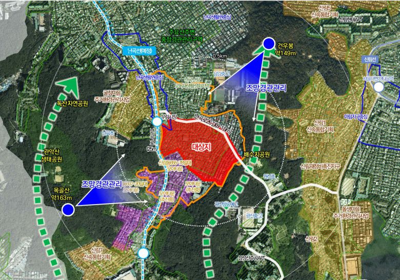 먼저 골짜기형 지형인 대상지 특성을 고려해 관악산 건우봉과 목골산을 향해 조망과 바람길이 확보되는 경관축을 마련한다. 또한 구릉지, 기존 시가지와의 조화를 이루는 높이 계획으로 입체적인 도시경관을 형성한다.
