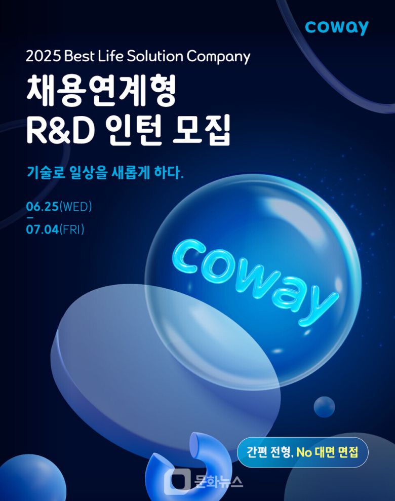 코웨이는 다음달 4일까지 채용연계형 연구개발(R&D) 인턴사원을 모집한다고 26일 밝혔다. 이번 인턴십은 역대 최대 규모로 진행되며, 두 자릿수 규모의 인원을 선발할 예정이다.