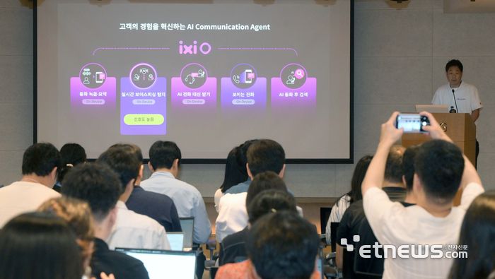 LG유플러스가 안티딥보이스 기술을 인공지능(AI) 통화 에이전트 서비스인 '익시오'에 탑재해 상용화한다. 26일 서울 중구 LG서울역빌딩에서 열린 LG유플러스 보안 기술 설명회에서 이석영 LG유플러스 모바일에이전트드라이브 담당이 발표를 하고 있다.