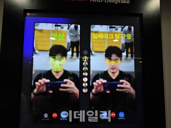 26일 LG서울역빌딩에서 열린 ‘보안 기술 설명회’에서 LG유플러스의 딥페이크 방지 기술을 체험해보고 있다.(사진=윤정훈 기자) |