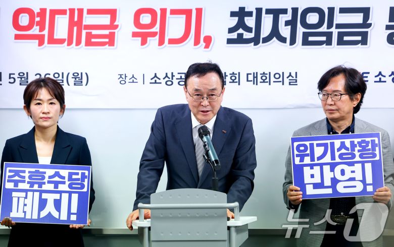 송치영 소상공인연합회장이 지난달 서울 영등포구 소공연 대회의실에서 2026년도 최저임금 동결 촉구 기자회견을 하고 있다. (공동취재) 2025.5.26/뉴스1 ⓒ News1 김명섭 기자