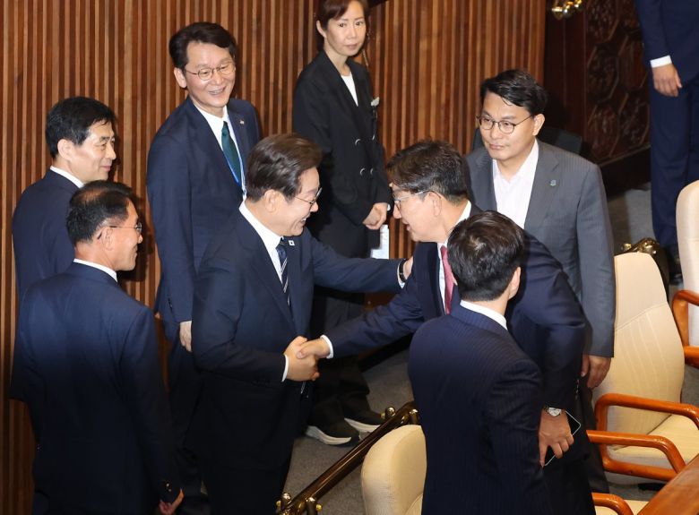 이재명 대통령이 26일 국회 본회의장에서 취임 후 첫 추가경정예산(추경) 시정연설을 마친 뒤 국민의힘 권성동 의원과 악수하고 있다. 송은석 기자 silverstone@donga.com |
