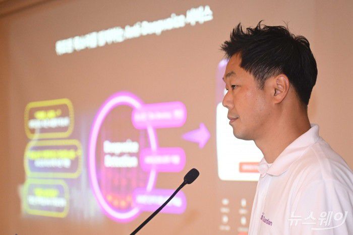 이석영 LGU+ 모바일서비스트라이브 담당이 26일 오전 서울 용산구 LG서울역빌딩에서 열린 '익시오 안티딥보이스(ixi-O Anti-DeepVoice)' 출시 AI 보안 기술설명회에서 발표를 하고 있다. 사진=강민석 기자 kms@newsway.co.kr