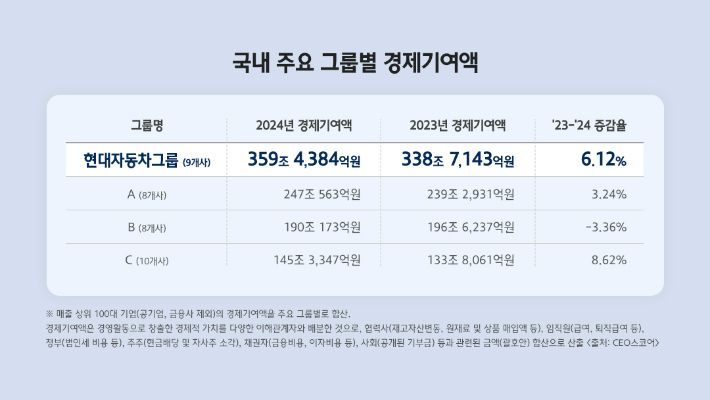 26일 기업데이터연구소인 CEO스코어가 500대 기업(공기업·금융사 제외) 가운데 사업보고서를 제출한 2024년 매출액 상위 100대 기업을 대상으로 분석한 결과를 보면, 국내 그룹 중 현대차그룹(9개사)의 경제기여액이 359조 4384억 원으로 가장 컸다.