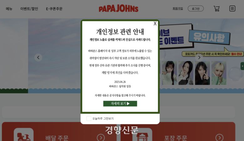 파파존스는 26일 홈페이지에 팝업 형태의 입장문을 내고 “개인정보 노출로 심려를 끼쳐드려 진심으로 사과드린다”고 밝혔다.
