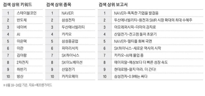 금융정보업체 에프앤가이드에 따르면 6월 18~24일 네이버가 종목 검색 순위 1위를 차지했다. 아울러 네이버 관련 보고서 'NAVER-똑똑한 기업의 발걸음'(다올투자증권 김혜영)은 보고서 검색 순위 1위에 올랐다. 키워드 검색 순위에서도 '스테이블코인'과 '반도체'에 이어 네이버가 3위라는 높은 순위를 기록했다. 네이버는 새 정부 AI 투자 확대에 따른 대표 수혜주로 부상하며 이 기간 주가가 40% 이상 단기 급등했다. 특히 네이버 출신 인사들이 잇달아 정부 고위직에 발탁되면서 기대감에 불을 지폈다. 지난 15일 하정우 네이버클라우드 AI 혁신센터장이 대통령실 초대 AI미래기획수석으로 임명된 데 이어, 23일에는 한성숙 전 네이버 대표이사가 중소벤처기업부 장관 후보자로 지명된 바 있다.