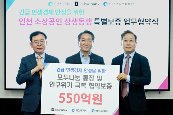 카카오뱅크가 인천시·인천신용보증재단과 인천 지역 소상공인을 위한 '모두나눔통장 금융지원' 업무 협약을 26일 체결했다. 이날 협약식에는 윤호영 카카오뱅크 대표이사와 유정복 인천시장, 전무수 인천신용보증재단 이사장이 참석했다.