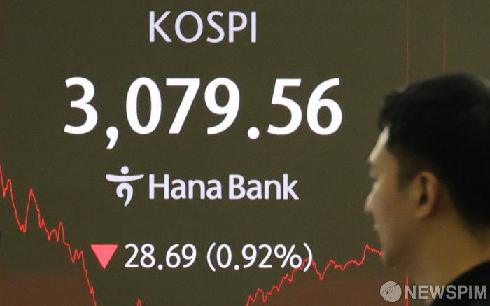 한국거래소에 따르면 이날 코스피 지수는 전일 대비 28.69포인트(0.92%) 내린 3079.56에 마감했다. 개인이 1조364억원 사들였고, 외국인과 기관은 각각 6891억원, 3196억원 팔아치웠다.