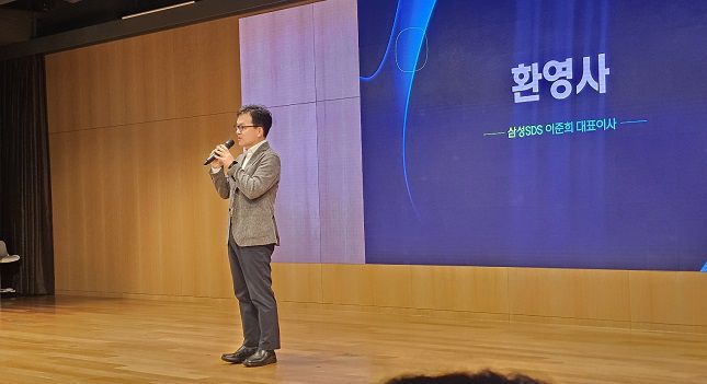 이준희 삼성SDS 대표가 26일 서울 송파구 삼성SDS 잠실캠퍼스에서 미디어데이를 열고 환영사를 하고 있다. /사진=비즈워치 |