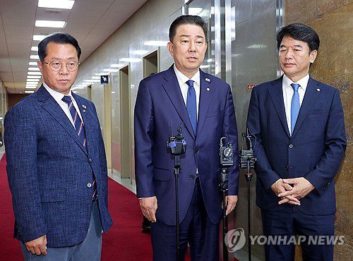 취재진 질문 답변하는 민주당 원내지도부(서울=연합뉴스) 류영석 기자 = 더불어민주당 김병기 원내대표(가운데), 문진석 원내수석부대표(오른쪽), 문금주 원내대변인이 26일 우원식 국회의장과 회동을 마친 뒤 취재진 질문에 답변하고 있다. 2025.6.26 ondol@yna.co.kr