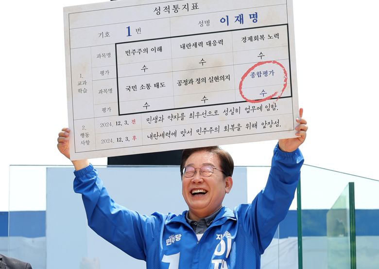 지난 1일 당시 더불어민주당 이재명 대선 후보가 경북 안동시 웅부공원에서 열린 유세에서 이 후보의 초등학교 은사인 박병기씨로부터 받은 대선 후보 모의 성적통지표를 든 채 기념촬영을 하고 있다. 뉴시스