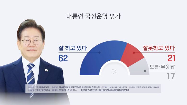 엠브레인퍼블릭·케이스탯리서치·코리아리서치·한국리서치가 지난 23일에서 25일까지 만 18세 이상 남녀 1,000명을 대상으로 진행한 전국지표조사(NBS)에서, '이 대통령이 일을 잘하고 있다고 생각하는가'라는 질문에 '잘하고 있다'는 답변은 62%로 집계됐습니다.
