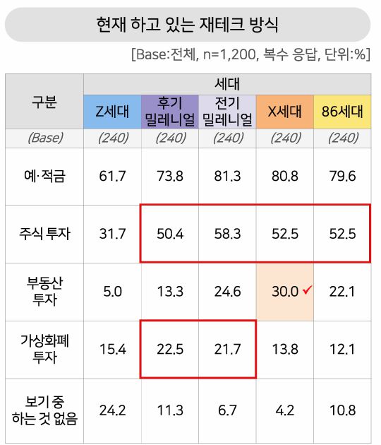 21년 7월 15일, 대학내일에서 전국의 만 15세 ~ 60세 남녀 1,200명을 대상으로 조사한 '세대별 재테크 현황 리포트'에 따르면, 현재 하고 있는 재테크 방식 중 전 세대에서 예·적금이 공통적으로 가장 높은 비율을 차지하였으며, 주식 투자의 경우 Z세대를 제외하고는 세대별 차이가 두드러지지 않지만, 부동상 투자와 가상화폐 투자의 경우 세대별 차이가 존재했다.