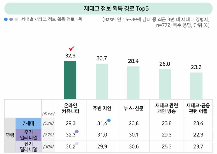 또한 재테크 정보 획득 경로로는 '온라인 커뮤니티'(32.9%), '주변 지인'(30.7%), '뉴스·신문'(28.4%) 순으로 나타났고, 밀레니얼 세대의 경우 온라인 커뮤니티를 통한 재테크 정보 획득 비율이 Z세대 대비 높은 편이었다.
