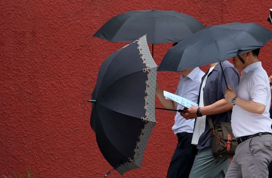 장마전선 영향으로 비가 내린 25일 오후 서울 중구 세종대로에서 시민들이 우산을 쓰고 이동하고 있다. 뉴시스