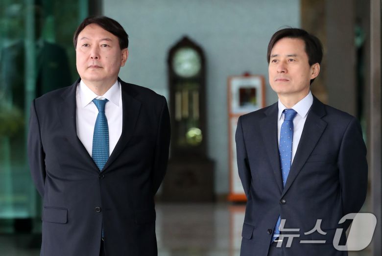 사진은 지난 2017년 10월 23일 조은석 당시 서울고검장(오른쪽)과 윤석열 서울중앙지검장이 서울고검에서 열린 국회 법사위 국정감사에 앞서 국감장에 도착하는 의원들을 기다리는 모습. 2025.6.13/뉴스1 ⓒ News1 오대일 기자